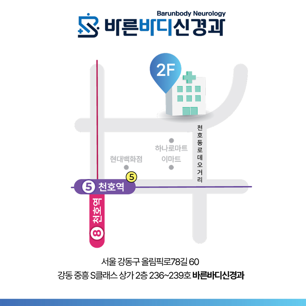 오시는길 바른바디신경과 강동밀레니얼중흥S-클래스상가 판매시설 상가 1동 2층 236~239호 서울특별시 강동구 올림픽로 78길60 네이버지도 길찾기 주차안내 강동밀레니얼중흥S-클래스 주차장 지하1층 판매시설 주차구역, 주차 무료 진료문의 02-475-7117